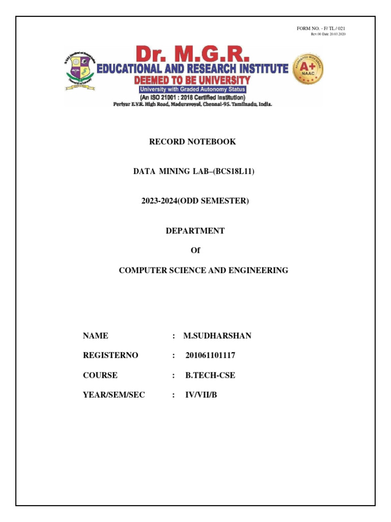 NAME OF THE LAB : DATA MINING LAB(BCS18L11)