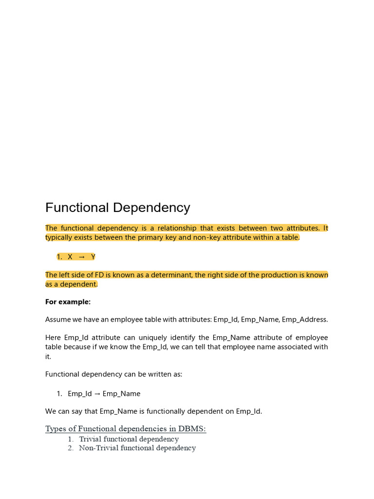 Here Emp_Id attribute can uniquely identify the Emp_Name attribute of employee
