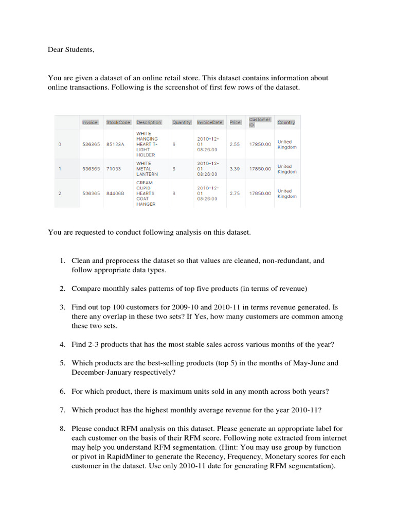 customer in the dataset. Use only 2010-11 date for generating RFM segmentation).