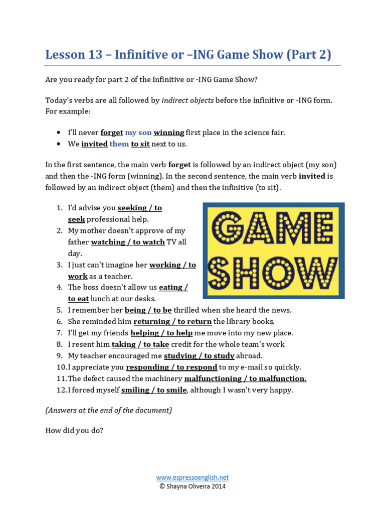 Lesson 13 – Infinitive or –ING Game Show (Part 2)