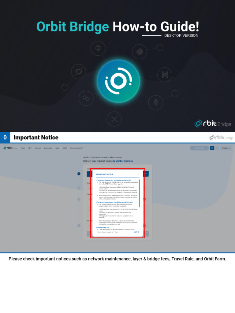 Please check important notices such as network maintenance, layer & bridge fees, Travel Rule, and Orbit Farm.