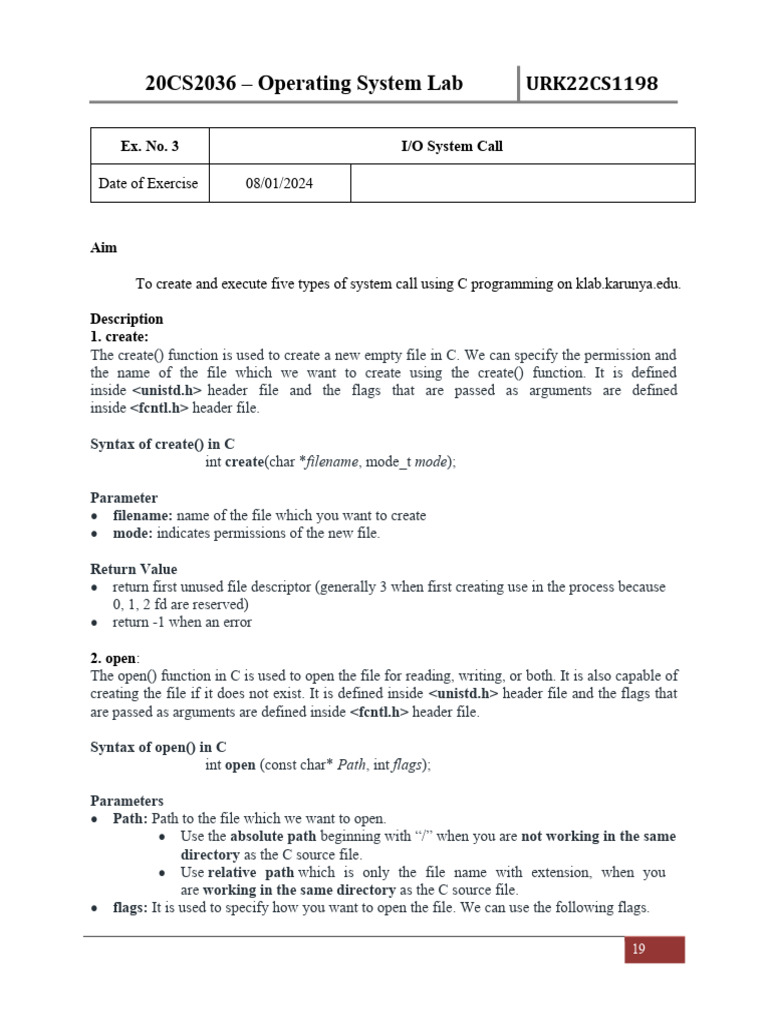 To create and execute five types of system call using C programming on klab.karunya.edu.