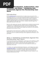 <deny users="?"/> </authorization> </system.web> </configuration> Note that the symbol "?" indicates all Non Authenticated and Anonymous users. Typically, the user enters the username and the password, clicks the login button and the form validates the values against values from that stored in a persistent store, usually a database. The following code snippet illustrates how this can be validated. String username = txtUserName.Text; String password = txtPassword.Text; bool isUserValid = false; //Code to validate the user name and password if(isUserValid) { FormsAuthentication.RedirectFromLoginPage(txtUserName.Text, False); else // User is not valid lblMessage.Text = Invalid login; } The RedirectFromLoginPage method creates an authentication ticket and is used to redirect an authenticated user back to the originally requested URL or the default URL. The following code snippet illustrates how we can specify the users credentials in the applications web.config file. <configuration> <system.web> <authentication mode="Forms"> <forms loginUrl="LoginForm.aspx"> <credentialspasswordFormat="Clear">