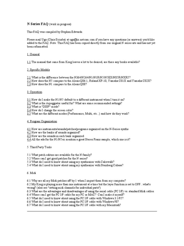 This FAQ was compiled by Stephen Edwards. Please mail Ugo (Chris Sciurba) at ugo@ix.netcom.com if you have any questions (or answers) you'd like added to the FAQ. Note: This FAQ has been copied directly from our original N series site and has not yet been reformatted. 1. General 1.1 The manual that came from Korg leaves a lot to be desired, are there any books available? 2. Specific Models 2.1 What is the difference between the N364/N264/N1/N1R/N5/N5EX/NS5R/NXR5? 2.2 How does the N5 compare to the Alesis QS6.1, Roland XP-10, Yamaha CS1X and Yamaha CS2X? 2.3 How does the N1 compare to the Alesis QS8? 3. Operation 3.1 How do I make the N1/N5 default to a different instrument when I turn it on? 3.2 What is the Arpeggiator useful for? What are some recommended settings? 3.3 What is "DISP" mode? 3.4 How do I change the screen color? 3.5 What are the different modes (Performance, Multi, etc...) and how do they work? 4. Program Organization 4.1 How are instruments/sounds/patches/programs organized on the N-Series synths 4.2 How are the banks of sounds organized? 4.3 How are the sounds in each bank organized 4.4 All the ads for the N1/N5ex mention a great Stereo Piano sample, which one is it? 5. Third Party Tools 5.1 What patch editors are available for the N family? 5.2 Where can I get good patches for the N series? 5.3 What do I need to know about using my synthesizer with Cakewalk? 5.4 What do I need to know about using my synthesizer with Steinberg Cubase? 6. Midi 6.1 Why are all my Midi patches off by 1 when I import them from my computer? 6.2 My Korg is playing more than one instrument at a time but the layer function is set to OFF...what's wrong? (also see "setting midi channels for individual parts") 6.3 What are the advantages and disadvantages of using the serial cable (PC I/F) vs. standard Midi cables. 6.4 Where can I get the PC I/F cable for my PC or MAC? Can I make it myself? 6.5 What do I need to know about using the PC I/F cable with Windows 3.1/95? 6.6 What do I need to know about using the PC I/F cable with Windows 98? 6.7 What do I need to know about using the PC I/F cable with my Macintosh?