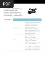 CCD image sensor HL-DV7W: 2/3" 16:9 520,000pixels IT CCD x3 (NTSC) HL-DV7W: 2/3" 16:9 600,000pixels IT CCD x3 (PAL) HL-DV5: 2/3" 4:3 410,000pixels IT CCD x3 (NTSC) HL-DV5: 2/3" 4:3 470,000pixels IT CCD x3 (PAL) Sensitivity f11 at 2000 lux Min Illuminaiton approx. 0.12 lux (f1.4, +48dB) S/N 64dB (NTSC), 62dB (PAL) H Resolution HL-DV7W: 800TV lines (at center) HL-DV5: 850TV lines (at center) V Resolution 400TV lines (Super V: Off) NTSC 450TV lines (Super V: Off) PAL 480TV lines (Super V: On) NTSC 570TV lines (Super V: On) PAL Registration 0.03% or less excluding lens aberration Smear level HL-DV7W: -125dB HL-DV5: -120dB Quantization 10bit Gain up -3.0, +3, +6, +9, +12, +18, +30dB Hyper Gain +30, +36, +42, +48dB Shutter(preset) 1/50(PAL/OFF), 1/60(NTSC/OFF), 1/100, 1/120, 1/250, 1/500, 1/1000, 1/2000 sec. Variable Shutter 1/60.3 ~ 1/787 sec (NTSC) 1/50.3 ~ 1/781 sec (PAL) Lens mount B4 Optical Filter 3000K, 5600K+1/16ND, 5600K, 5600K+1/64ND Ext Sync Signal VBS 1V p-p 6dB 75 or BBS 0.45Vp-p 6dB 75 Video Output VBS 1Vp-p 75 Monitor Output VBS or VS 1Vp-p 75 Y/C Output(Option) Y: 1.0Vp-p 75 C: 0.286Vp-p 75
