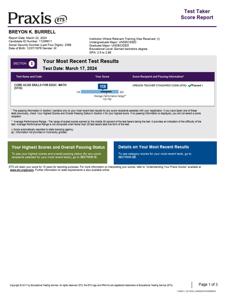 * The passing information in Section I pertains only to your most recent test results for any score recipients selected with your registration. If you have taken one of these