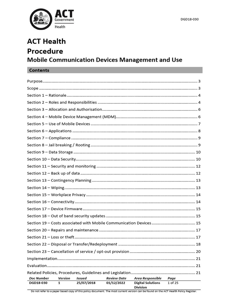 Whole of Government Mobile Devices Policy and the ACT Health Information and