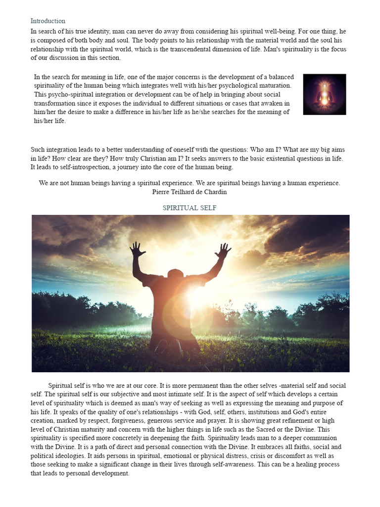 relationship with the spiritual world, which is the transcendental dimension of life. Man's spirituality is the focus