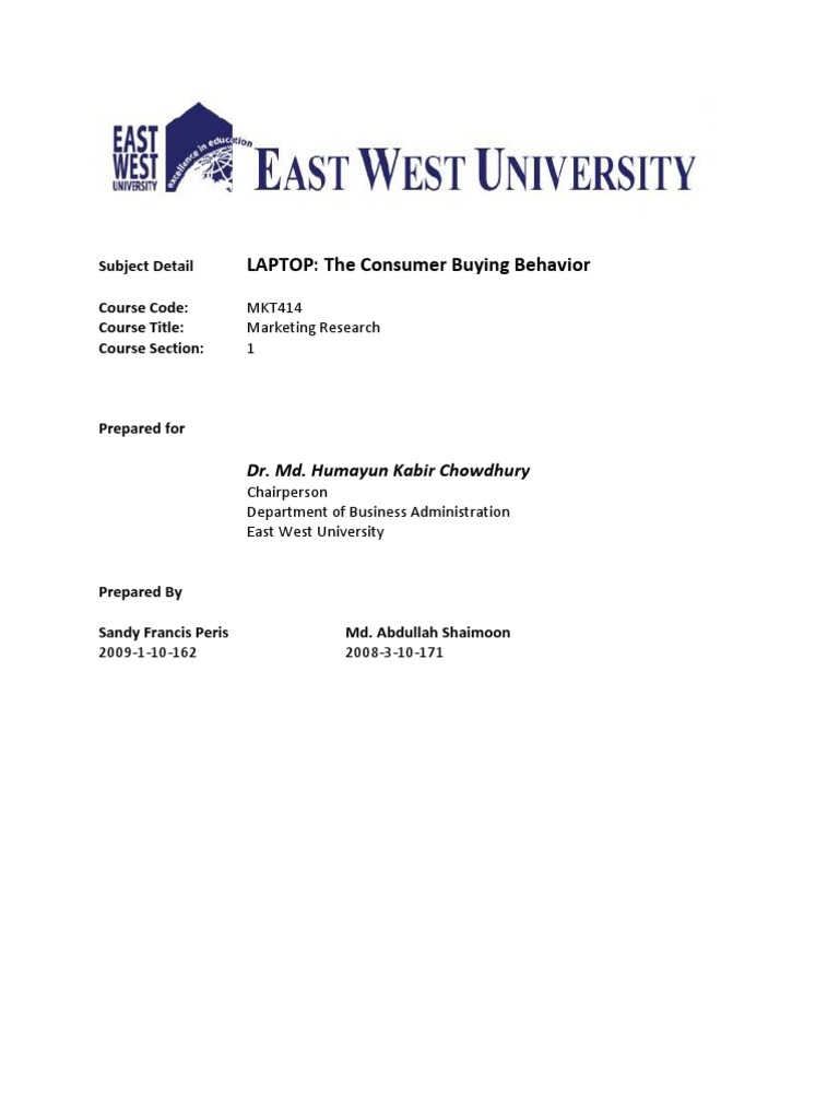 We are the students of East West University are doing the course Marketing Research (MKT414) as part of our Bachelor of Business Administration program. As requirement of the course we need to conduct a survey of Consumer Buying Behavior of Laptop. We ensure you that all the data given by you will be held confidential and will be use for academic purpose and after using the data we will destroy the data. So we ensure you about the security of you given information. We wish for your co-operation.