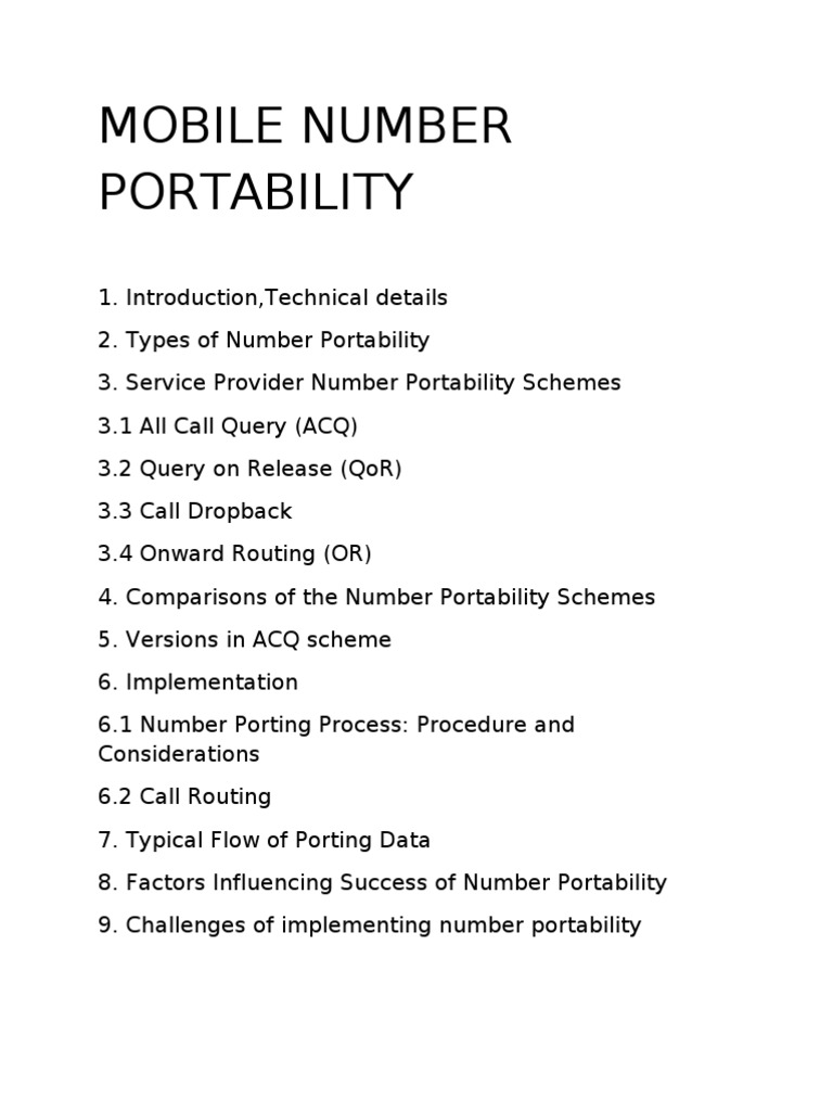 1. Introduction,Technical details 2. Types of Number Portability 3. Service Provider Number Portability Schemes 3.1 All Call Query (ACQ) 3.2 Query on Release (QoR) 3.3 Call Dropback 3.4 Onward Routing (OR) 4. Comparisons of the Number Portability Schemes 5. Versions in ACQ scheme 6. Implementation 6.1 Number Porting Process: Procedure and Considerations 6.2 Call Routing 7. Typical Flow of Porting Data 8. Factors Influencing Success of Number Portability 9. Challenges of implementing number portability