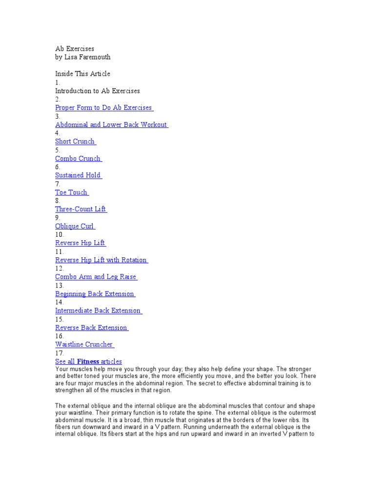 Ab Exercises by Lisa Faremouth Inside This Article 1. Introduction to Ab Exercises 2. Proper Form to Do Ab Exercises 3.