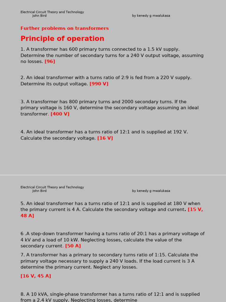 8. A 10 kVA, single-phase transformer has a turns ratio of 12:1 and is supplied