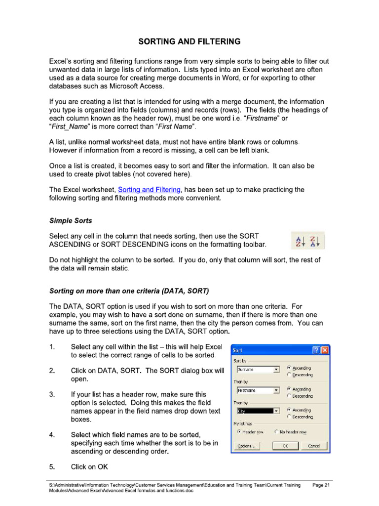 The Excel worksheet, Sorting and Filtering, has been set up to make practicing the