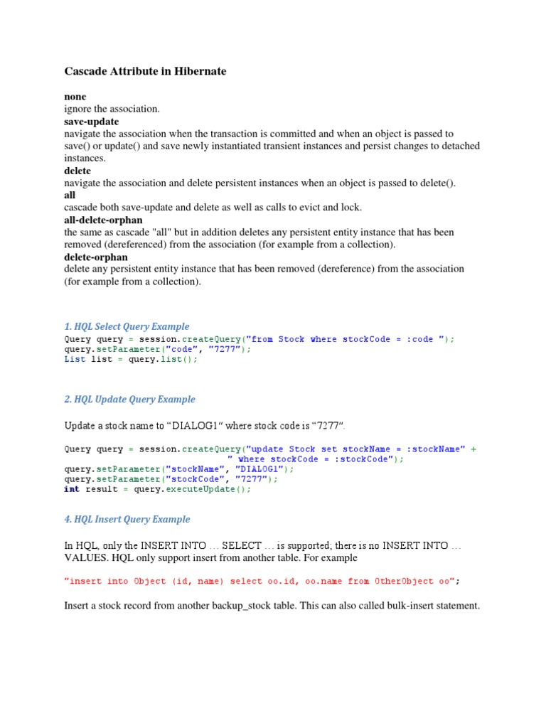 String hql = "from Stock s where s.stockCode = :stockCode"; List result = session.createQuery(hql) .setParameter("stockCode", "7277") .list();