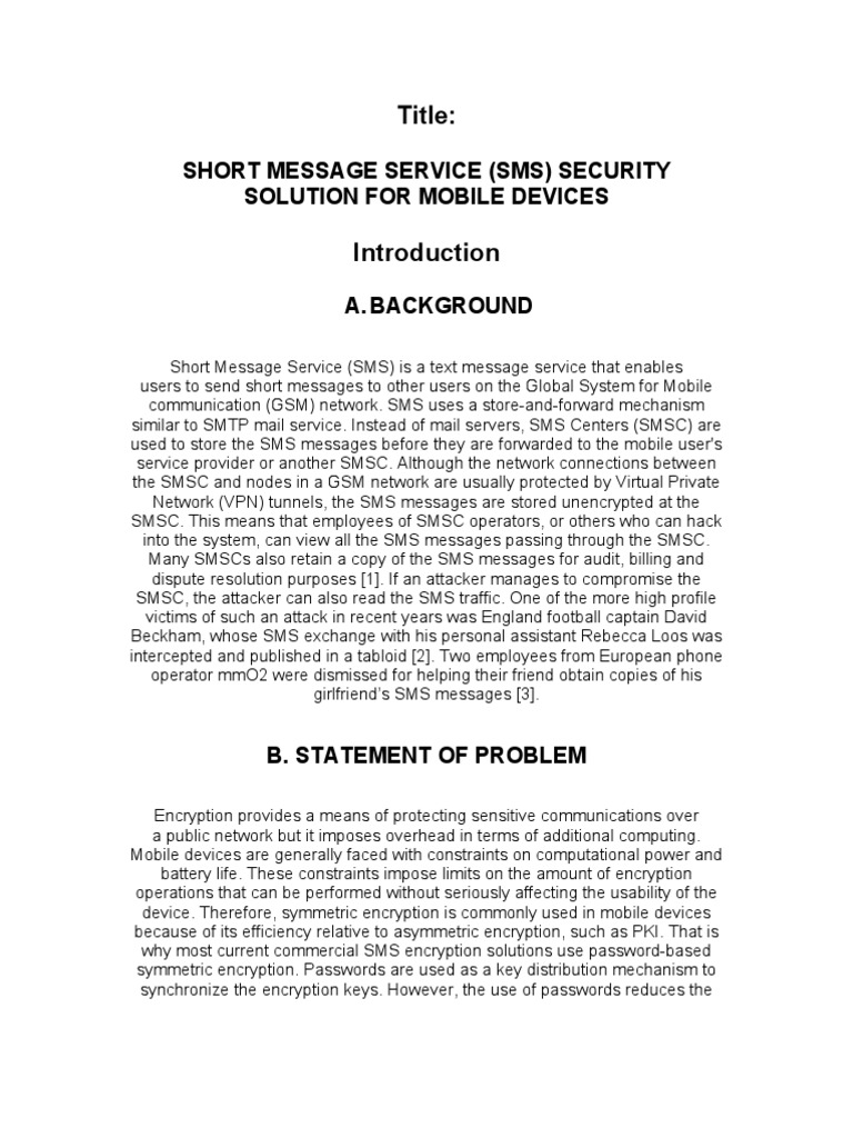 The remainder of the thesis is organized as follows. Chapter II provides an overview of the security issues surrounding SMS, from the GSM infrastructure to the mobile device. This Chapter also highlights some applications where the security of the SMS is of paramount importance if it is to be used as a delivery mechanism in the application. Chapter III discusses the issues surrounding the use of encryption in mobile devices. It highlights some of the key considerations when choosing a suitable encryption scheme. The results of an experiment to measure some of the performance metrics are also discussed in this Chapter. Chapter IV describes the Secure Chat demonstration application that was developed to show how SMS messages can be secured using encryption. Chapter V concludes the thesis and provides recommendations for further research in this area.