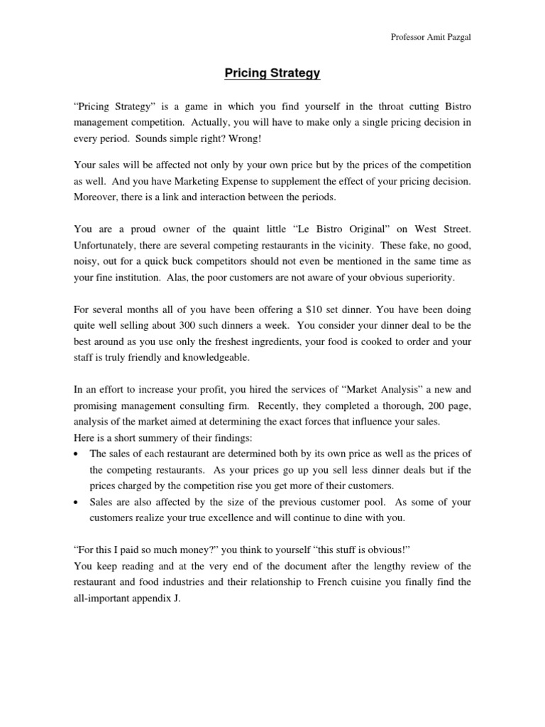 Pricing Strategy is a game in which you find yourself in the throat cutting Bistro management competition. Actually, you will have to make only a single pricing decision in every period. Sounds simple right? Wrong! Your sales will be affected not only by your own price but by the prices of the competition as well. And you have Marketing Expense to supplement the effect of your pricing decision. Moreover, there is a link and interaction between the periods. You are a proud owner of the quaint little Le Bistro Original on West Street. Unfortunately, there are several competing restaurants in the vicinity. These fake, no good, noisy, out for a quick buck competitors should not even be mentioned in the same time as your fine institution. Alas, the poor customers are not aware of your obvious superiority. For several months all of you have been offering a $10 set dinner. You have been doing quite well selling about 300 such dinners a week. You consider your dinner deal to be the best around as you use only the freshest ingredients, your food is cooked to order and your staff is truly friendly and knowledgeable. In an effort to increase your profit, you hired the services of Market Analysis a new and promising management consulting firm. Recently, they completed a thorough, 200 page, analysis of the market aimed at determining the exact forces that influence your sales. Here is a short summery of their findings: The sales of each restaurant are determined both by its own price as well as the prices of the competing restaurants. As your prices go up you sell less dinner deals but if the prices charged by the competition rise you get more of their customers. Sales are also affected by the size of the previous customer pool. As some of your customers realize your true excellence and will continue to dine with you. For this I paid so much money? you think to yourself this stuff is obvious! You keep reading and at the very end of the document after the lengthy review of the restaurant and food industries and their relationship to French cuisine you finally find the all-important appendix J.