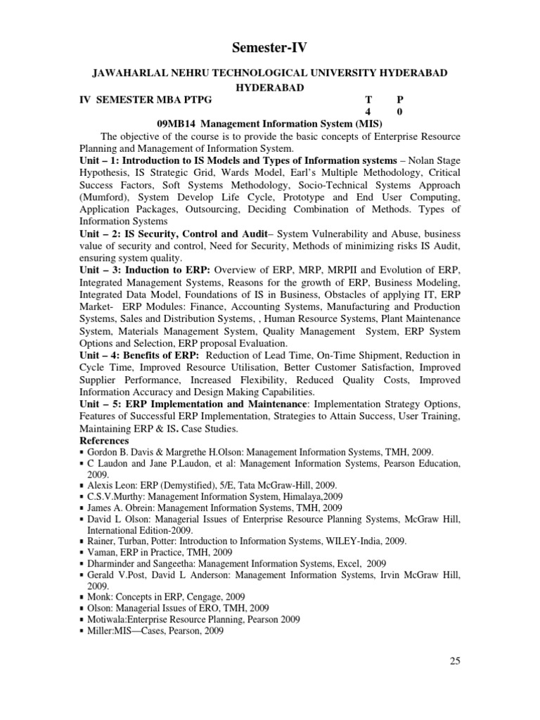 JAWAHARLAL NEHRU TECHNOLOGICAL UNIVERSITY HYDERABAD HYDERABAD IV SEMESTER MBA PTPG T P 4 0 09MB14 Management Information System (MIS) The objective of the course is to provide the basic concepts of Enterprise Resource Planning and Management of Information System. Unit 1: Introduction to IS Models and Types of Information systems Nolan Stage Hypothesis, IS Strategic Grid, Wards Model, Earls Multiple Methodology, Critical Success Factors, Soft Systems Methodology, Socio-Technical Systems Approach (Mumford), System Develop Life Cycle, Prototype and End User Computing, Application Packages, Outsourcing, Deciding Combination of Methods. Types of Information Systems Unit 2: IS Security, Control and Audit System Vulnerability and Abuse, business value of security and control, Need for Security, Methods of minimizing risks IS Audit, ensuring system quality. Unit 3: Induction to ERP: Overview of ERP, MRP, MRPII and Evolution of ERP, Integrated Management Systems, Reasons for the growth of ERP, Business Modeling, Integrated Data Model, Foundations of IS in Business, Obstacles of applying IT, ERP Market- ERP Modules: Finance, Accounting Systems, Manufacturing and Production Systems, Sales and Distribution Systems, , Human Resource Systems, Plant Maintenance System, Materials Management System, Quality Management System, ERP System Options and Selection, ERP proposal Evaluation. Unit 4: Benefits of ERP: Reduction of Lead Time, On-Time Shipment, Reduction in Cycle Time, Improved Resource Utilisation, Better Customer Satisfaction, Improved Supplier Performance, Increased Flexibility, Reduced Quality Costs, Improved Information Accuracy and Design Making Capabilities. Unit 5: ERP Implementation and Maintenance: Implementation Strategy Options, Features of Successful ERP Implementation, Strategies to Attain Success, User Training, Maintaining ERP & IS. Case Studies. References