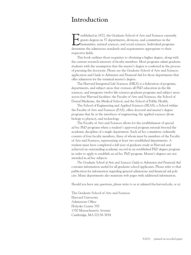 stablished in 1872, the Graduate School of Arts and Sciences currently grants degrees in 57 departments, divisions, and committees in the humanities, natural sciences, and social sciences. Individual programs determine the admissions standards and requirements appropriate to their respective elds. This book outlines those requisites to obtaining a higher degree, along with the current research interests of faculty members. Most programs admit graduate students with the assumption that the masters degree is conferred in the process of pursuing the doctorate. Please see the Graduate School of Arts and Sciences application and Guide to Admission and Financial Aid for those departments that offer admission for the terminal masters degree. The Harvard Integrated Life Sciences (HILS) is a federation of programs, departments, and subject areas that oversees all PhD education in the life sciences, and integrates twelve life sciences graduate programs and subject areas across four Harvard faculties: the Faculty of Arts and Sciences, the School of Dental Medicine, the Medical School, and the School of Public Health. The School of Engineering and Applied Sciences (SEAS), a School within the Faculty of Arts and Sciences (FAS), offers doctoral and masters degree programs that lie at the interfaces of engineering, the applied sciences (from biology to physics), and technology. The Faculty of Arts and Sciences allows for the establishment of special ad hoc PhD programs when a students approved program extends beyond the academic discipline of a single department. Each ad hoc committee ordinarily consists of four faculty members, three of whom must be members of the Faculty of Arts and Sciences, representing at least two established departments. A student must have completed a full year of graduate study at Harvard and achieved an outstanding academic record in an established PhD degree program in order to apply to establish an ad hoc PhD program. Masters degrees are not awarded in ad hoc subjects. The Graduate School of Arts and Sciences Guide to Admission and Financial Aid contains information useful for all graduate school applicants. Please refer to that publication for information regarding general admissions and nancial aid policies. Many departments also maintain web pages with additional information.