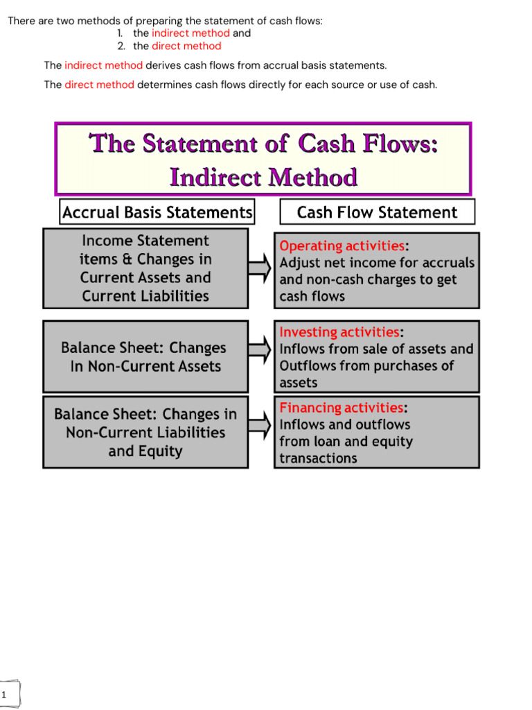 The indirect method derives cash flows from accrual basis statements.