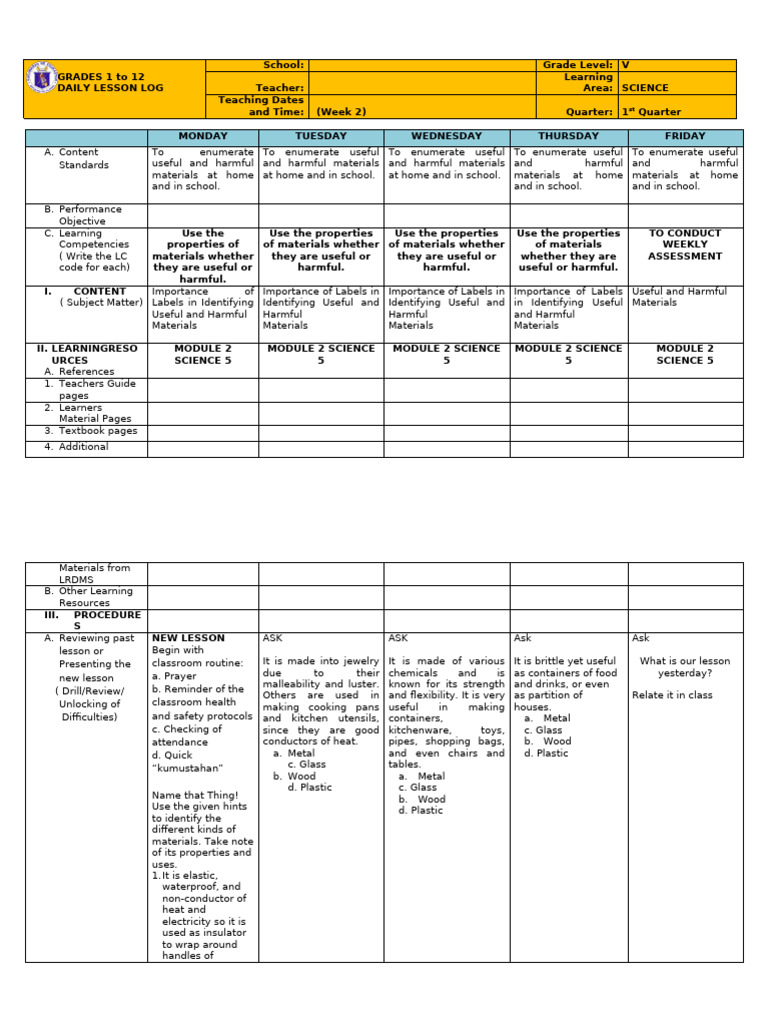 DAILY LESSON LOG Teacher: Area: SCIENCE