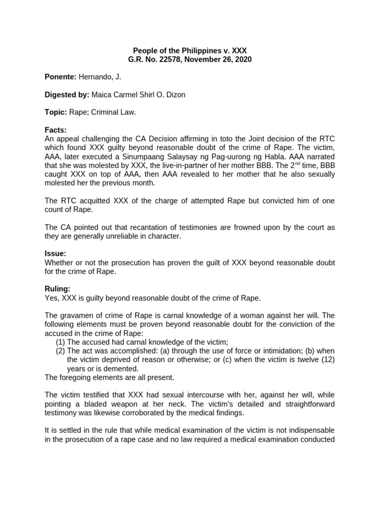 Yes, XXX is guilty beyond reasonable doubt of the crime of Rape.