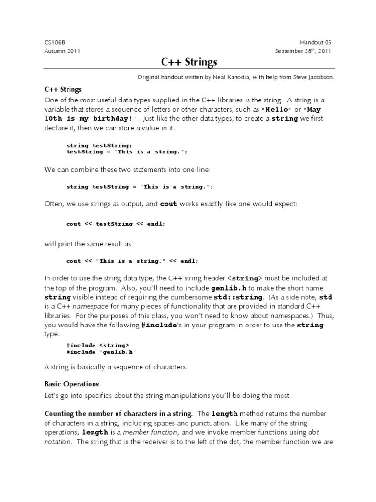 3 an out-of-bounds index tends to produce difficult-to-track-down errors. There is an alternate member function at(index) that retrieves the character at a position with the benefit of built-in range-checking. Passing, returning, assigning strings. C++ string variables are designed to behave like ordinary primitive types with regard to assignment. Assigning one string to another makes a new copy of the character sequence. For example: