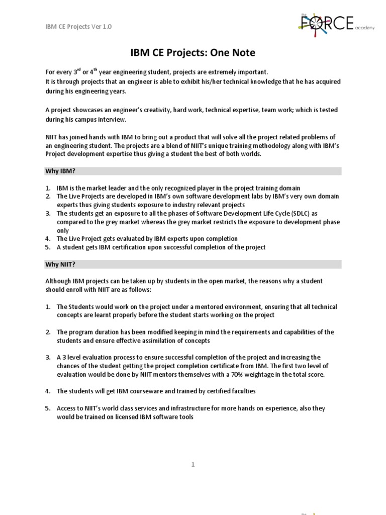 For every 3rd or 4th year engineering student, projects are extremely important. It is through projects that an engineer is able to exhibit his/her technical knowledge that he has acquired during his engineering years. A project showcases an engineers creativity, hard work, technical expertise, team work; which is tested during his campus interview. NIIT has joined hands with IBM to bring out a product that will solve all the project related problems of an engineering student. The projects are a blend of NIITs unique training methodology along with IBMs Project development expertise thus giving a student the best of both worlds. Why IBM? 1. IBM is the market leader and the only recognized player in the project training domain 2. The Live Projects are developed in IBMs own software development labs by IBMs very own domain experts thus giving students exposure to industry relevant projects 3. The students get an exposure to all the phases of Software Development Life Cycle (SDLC) as compared to the grey market whereas the grey market restricts the exposure to development phase only 4. The Live Project gets evaluated by IBM experts upon completion 5. A student gets IBM certification upon successful completion of the project Why NIIT? Although IBM projects can be taken up by students in the open market, the reasons why a student should enroll with NIIT are as follows: 1. The Students would work on the project under a mentored environment, ensuring that all technical concepts are learnt properly before the student starts working on the project 2. The program duration has been modified keeping in mind the requirements and capabilities of the students and ensure effective assimilation of concepts 3. A 3 level evaluation process to ensure successful completion of the project and increasing the chances of the student getting the project completion certificate from IBM. The first two level of evaluation would be done by NIIT mentors themselves with a 70% weightage in the total score. 4. The students will get IBM courseware and trained by certified faculties 5. Access to NIITs world class services and infrastructure for more hands on experience, also they would be trained on licensed IBM software tools