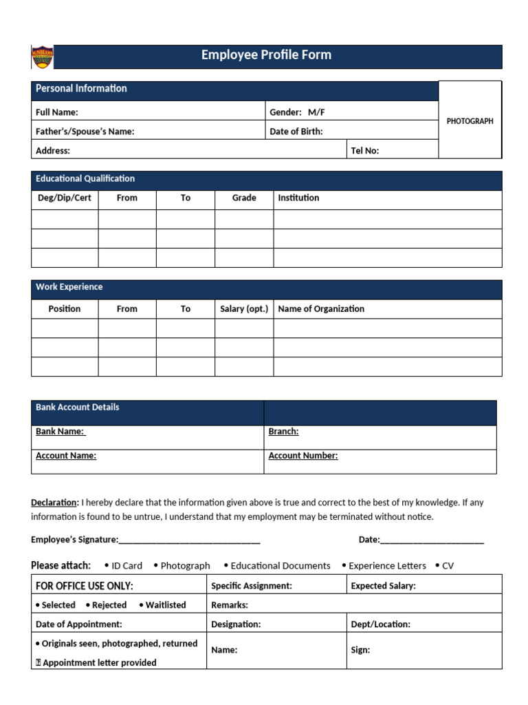 Please attach: ID Card Photograph Educational Documents Experience Letters CV