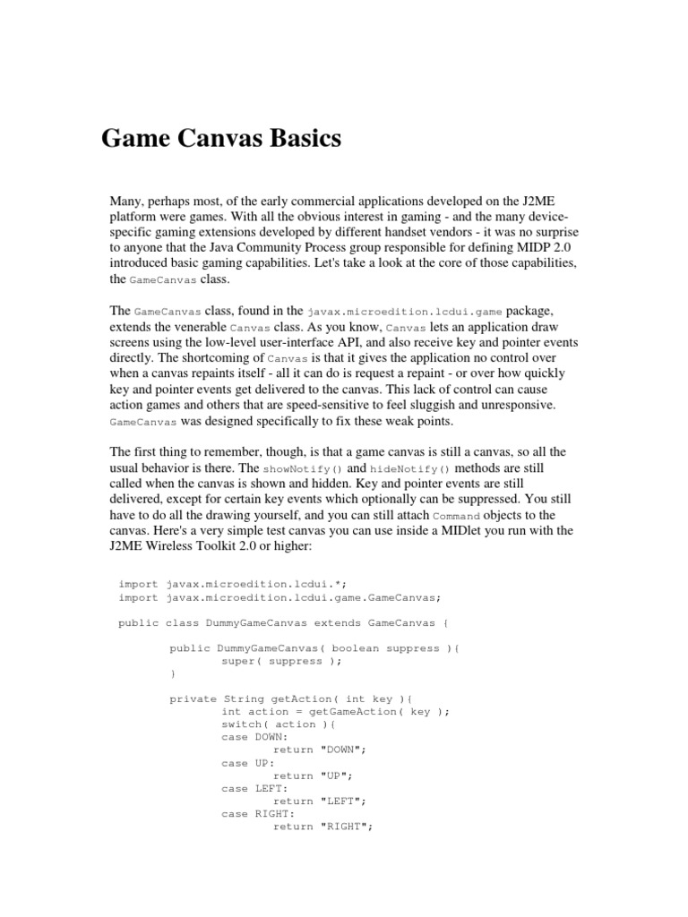 Many, perhaps most, of the early commercial applications developed on the J2ME platform were games. With all the obvious interest in gaming - and the many devicespecific gaming extensions developed by different handset vendors - it was no surprise to anyone that the Java Community Process group responsible for defining MIDP 2.0 introduced basic gaming capabilities. Let's take a look at the core of those capabilities, the GameCanvas class. The GameCanvas class, found in the javax.microedition.lcdui.game package, extends the venerable Canvas class. As you know, Canvas lets an application draw screens using the low-level user-interface API, and also receive key and pointer events directly. The shortcoming of Canvas is that it gives the application no control over when a canvas repaints itself - all it can do is request a repaint - or over how quickly key and pointer events get delivered to the canvas. This lack of control can cause action games and others that are speed-sensitive to feel sluggish and unresponsive. GameCanvas was designed specifically to fix these weak points. The first thing to remember, though, is that a game canvas is still a canvas, so all the usual behavior is there. The showNotify() and hideNotify() methods are still called when the canvas is shown and hidden. Key and pointer events are still delivered, except for certain key events which optionally can be suppressed. You still have to do all the drawing yourself, and you can still attach Command objects to the canvas. Here's a very simple test canvas you can use inside a MIDlet you run with the J2ME Wireless Toolkit 2.0 or higher: