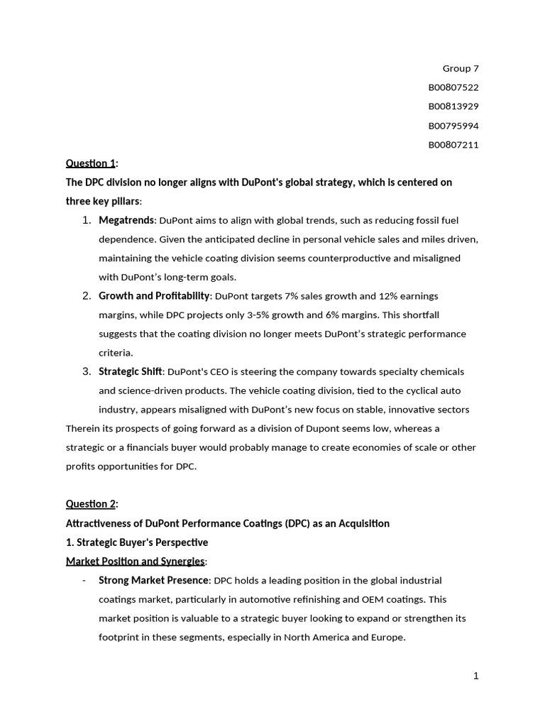 Attractiveness of DuPont Performance Coatings (DPC) as an Acquisition