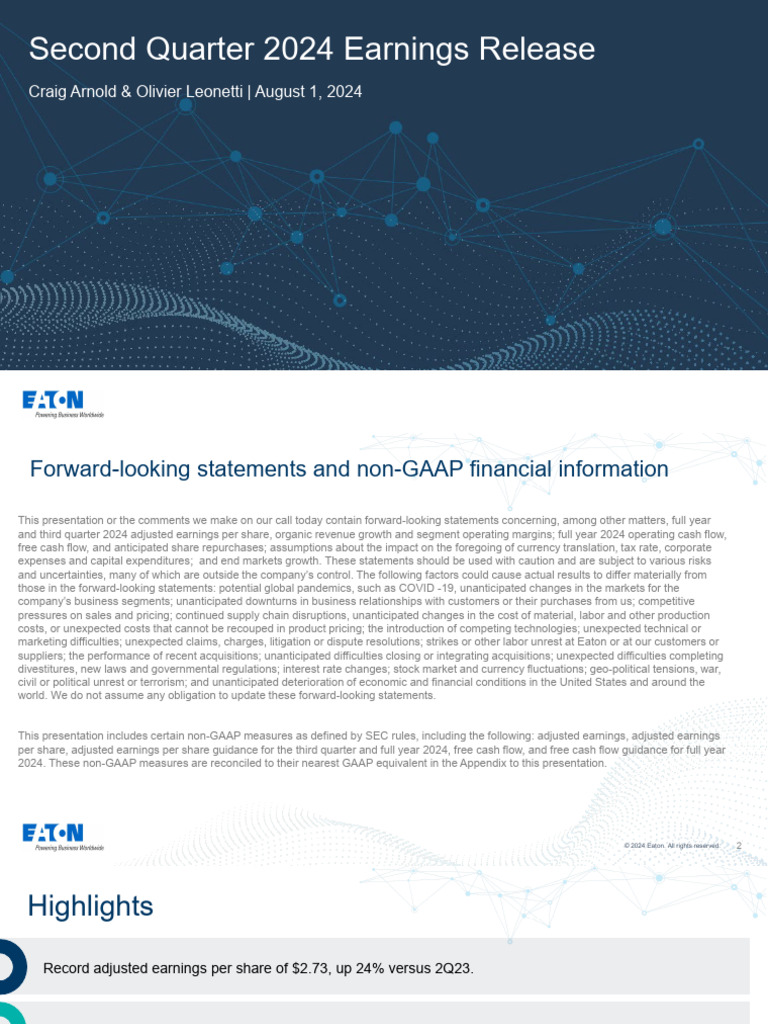Raising 2024 Eaton guidance for organic growth, segment margins, adjusted EPS and cash flow.