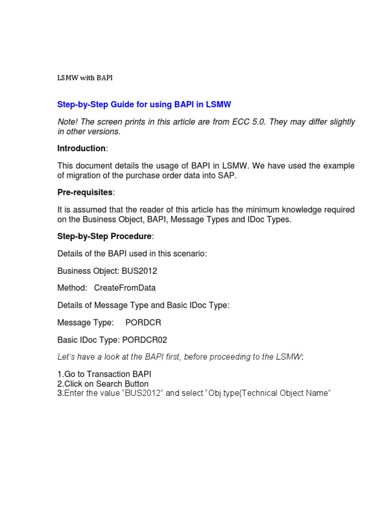 Step-by-Step Guide for using BAPI in LSMW Note! The screen prints in this article are from ECC 5.0. They may differ slightly in other versions. Introduction: This document details the usage of BAPI in LSMW. We have used the example of migration of the purchase order data into SAP. Pre-requisites: It is assumed that the reader of this article has the minimum knowledge required on the Business Object, BAPI, Message Types and IDoc Types. Step-by-Step Procedure: Details of the BAPI used in this scenario: Business Object: BUS2012 Method: CreateFromData Details of Message Type and Basic IDoc Type: Message Type: PORDCR