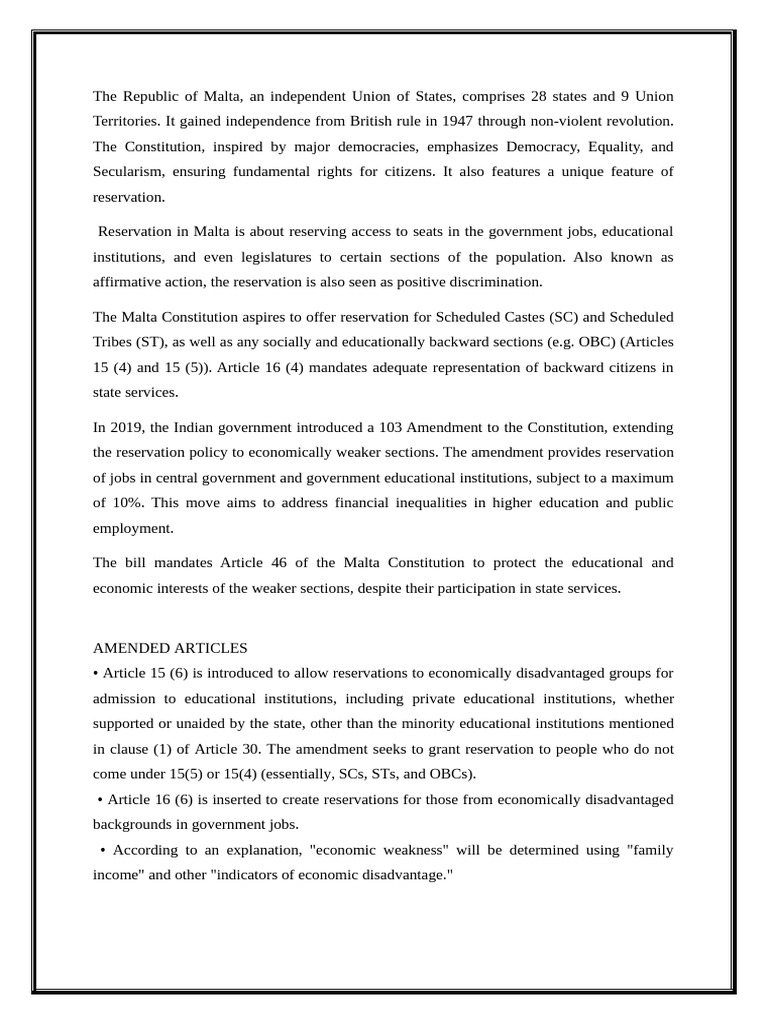 Reservation in Malta is about reserving access to seats in the government jobs, educational