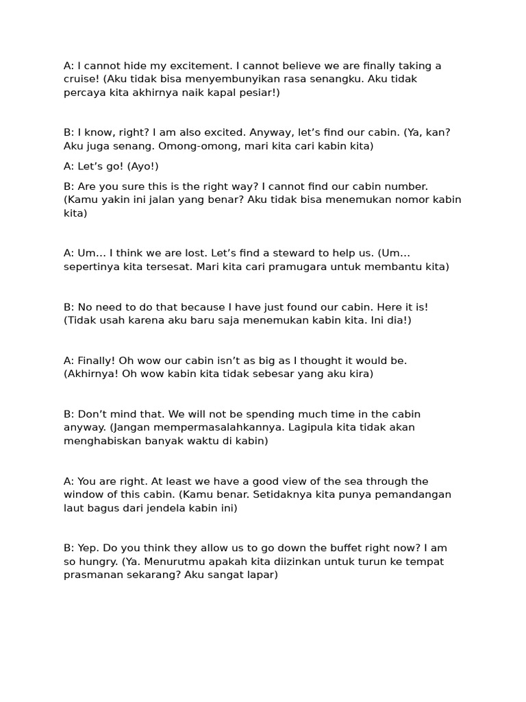A: Great! Me neither. Let’s go to the deck. (Bagus! Aku juga tidak. Ayo kita