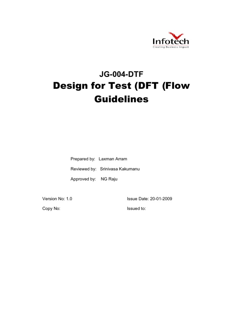 As always, the primary objective of DFT is to provide the capability to generate and apply a high quality test set in an efficient and cost effective manner. Understand design description from the test perspective 1. Components to be tested such as IOs, RAM/ROM, PLL/DLL, IPs, Analog blocks and the core logic. Mention the Full Chip block diagram highlighting test requirements. 2. List of Hard and soft IPs 3. Functional clock domains and maximum frequency of operation 4. Existing test structures 5. Physical partitioning information 6. Clocking and Flop count information for each physical block Understand test features recommended for the targeted process technology 1. stuck-at fault test 2. transition fault test 3. path delay test 4. bridging fault test