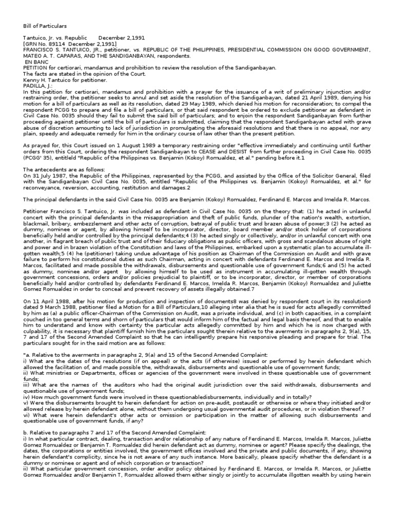 TANTUICO, JR., petitioner, vs. REPUBLIC OF THE PHILIPPINES, PRESIDENTIAL COMMISSION ON GOOD GOVERNMENT, MATEO A. T. CAPARAS, AND THE SANDIGANBAYAN, respondents. EN BANC PETITION for certiorari, mandamus and prohibition to review the resolution of the Sandiganbayan. The facts are stated in the opinion of the Court. Kenny H. Tantuico for petitioner. PADILLA, J.: In this petition for certiorari, mandamus and prohibition with a prayer for the issuance of a writ of preliminary injunction and/or restraining order, the petitioner seeks to annul and set aside the resolution of the Sandiganbayan, dated 21 April 1989, denying his motion for a bill of particulars as well as its resolution, dated 29 May 1989, which denied his motion for reconsideration; to compel the respondent PCGG to prepare and file a bill of particulars, or that said respondent be ordered to exclude petitioner as defendant in Civil Case No. 0035 should they fail to submit the said bill of particulars; and to enjoin the respondent Sandiganbayan from further proceeding against petitioner until the bill of particulars is submitted, claiming that the respondent Sandiganbayan acted with grave abuse of discretion amounting to lack of jurisdiction in promulgating the aforesaid resolutions and that there is no appeal, nor any plain, speedy and adequate remedy for him in the ordinary course of law other than the present petition. As prayed for, this Court issued on 1 August 1989 a temporary restraining order "effective immediately and continuing until further orders from this Court, ordering the respondent Sandiganbayan to CEASE and DESIST from further proceeding in Civil Case No. 0035 (PCGG' 35), entitleld "Republic of the Philippines vs. Benjamin (Kokoy) Romualdez, et al." pending before it.1 The antecedents are as follows: On 31 July 1987, the Republic of the Philippines, represented by the PCGG, and assisted by the Office of the Solicitor General, filed with the Sandiganbayan Civil Case No. 0035, entitled "Republic of the Philippines vs. Benjamin (Kokoy) Romualdez, et al." for reconveyance, reversion, accounting, restitution and damages.2 The principal defendants in the said Civil Case No. 0035 are Benjamin (Kokoy) Romualdez, Ferdinand E. Marcos and Imelda R. Marcos. Petitioner Francisco S. Tantuico, Jr. was included as defendant in Civil Case No. 0035 on the theory that: (1) he acted in unlawful concert with the principal defendants in the misappropriation and theft of public funds, plunder of the nation's wealth, extortion, blackmail, bribery, embezzlement and other acts of corruption, betrayal of public trust and brazen abuse of power;3 (2) he acted as dummy, nominee or agent, by allowing himself to be incorporator, director, board member and/or stock holder of corporations beneficially held and/or controlled by the principal defendants;4 (3) he acted singly or collectively, and/or in unlawful concert with one another, in flagrant breach of public trust and of their fiduciary obligations as public officers, with gross and scandalous abuse of right and power and in brazen violation of the Constitution and laws of the Philippines, embarked upon a systematic plan to accumulate illgotten wealth;5 (4) he (petitioner) taking undue advantage of his position as Chairman of the Commission on Audit and with grave failure to perform his constitutional duties as such Chairman, acting in concert with defendants Ferdinand E. Marcos and Imelda R. Marcos, facilitated and made possible the withdrawals, disbursements and questionable use of government funds;6 and (5) he acted as dummy, nominee and/or agent by allowing himself to be used as instrument in accumulating ill-gotten wealth through government concessions, orders and/or policies prejudicial to plaintiff, or to be incorporator, director, or member of corporations beneficially held and/or controlled by defendants Ferdinand E. Marcos, Imelda R. Marcos, Benjamin (Kokoy) Romualdez and Juliette Gomez Romualdez in order to conceal and prevent recovery of assets illegally obtained.7 On 11 April 1988, after his motion for production and inspection of documents8 was denied by respondent court in its resolution9 dated 9 March 1988, petitioner filed a Motion for a Bill of Particulars,10 alleging inter alia that he is sued for acts allegedly committed by him as (a) a public officer-Chairman of the Commission on Audit, was a private individual, and (c) in both capacities, in a complaint couched in too general terms and shorn of particulars that would inform him of the factual and legal basis thereof, and that to enable him to understand and know with certainty the particular acts allegedly committed by him and which he is now charged with culpability, it is necessary that plaintiff furnish him the particulars sought therein relative to the averments in paragraphs 2, 9(a), 15, 7 and 17 of the Second Amended Complaint so that he can intelligently prepare his responsive pleading and prepare for trial. The particulars sought for in the said motion are as follows: "a. Relative to the averments in paragraphs 2, 9(a) and 15 of the Second Amended Complaint: i) What are the dates of the resolutions (if on appeal) or the acts (if otherwise) issued or performed by herein defendant which allowed the facilitation of, and made possible the, withdrawals, disbursements and questionable use of government funds; ii) What ministries or Departments, offices or agencies of the government were involved in these questionable use of government funds; iii) What are the names of the auditors who had the original audit jurisdiction over the said withdrawals, disbursements and questionable use of government funds; iv) How much government funds were involved in these questionabledisbursements, individually and in totally? v) Were the disbursements brought to herein defendant for action on pre-audit, postaudit or otherwise or where they initiated and/or allowed release by herein defendant alone, without them undergoing usual governm