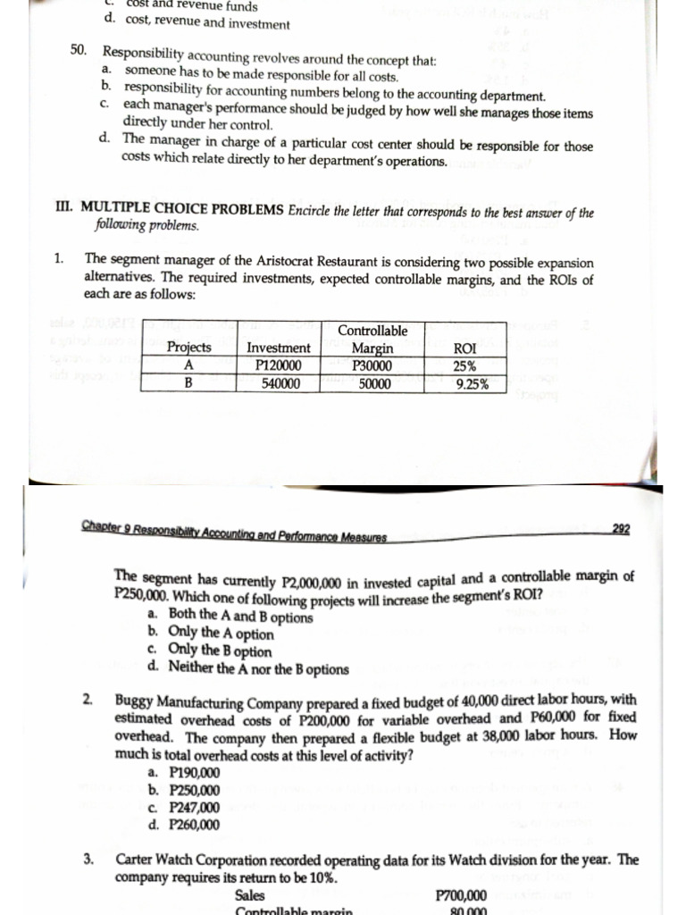 'P50,00 in controllable fixed costs. Will the new ROI be acceptable?