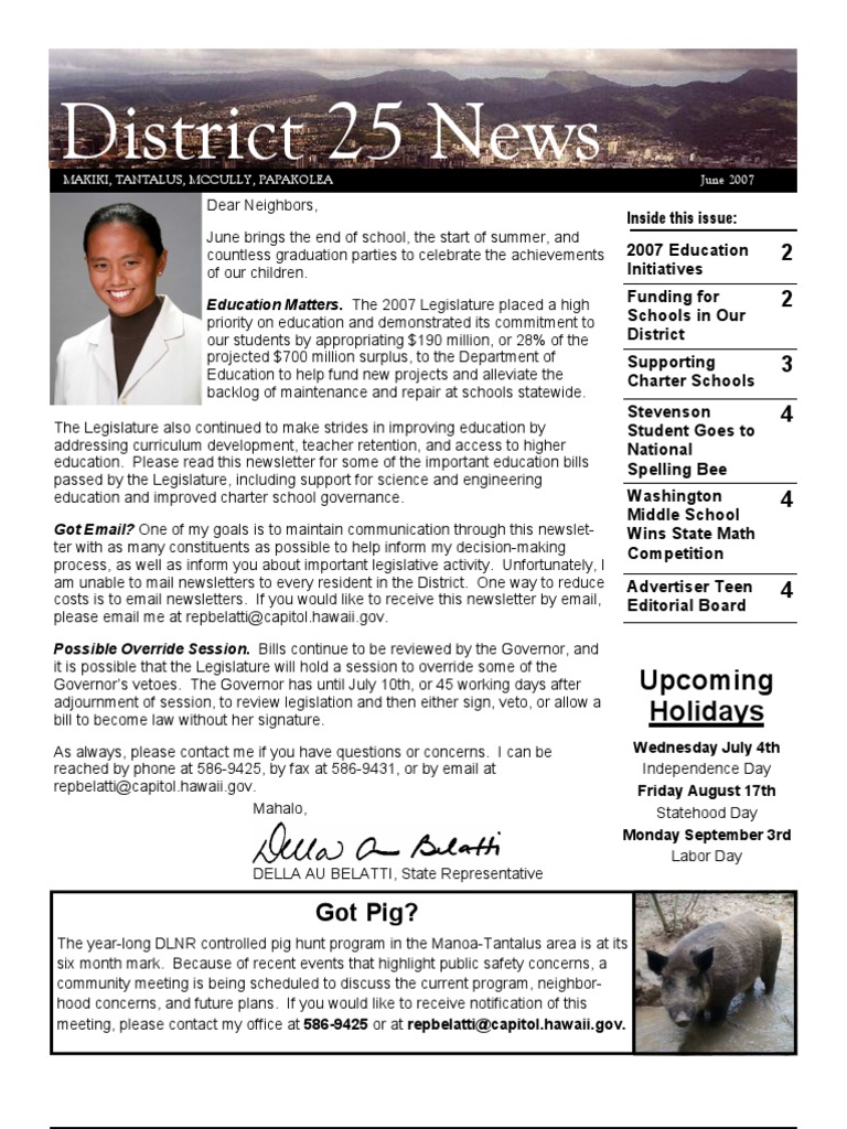 Dear Neighbors, June brings the end of school, the start of summer, and countless graduation parties to celebrate the achievements of our children. Education Matters. The 2007 Legislature placed a high priority on education and demonstrated its commitment to our students by appropriating $190 million, or 28% of the projected $700 million surplus, to the Department of Education to help fund new projects and alleviate the backlog of maintenance and repair at schools statewide. The Legislature also continued to make strides in improving education by addressing curriculum development, teacher retention, and access to higher education. Please read this newsletter for some of the important education bills passed by the Legislature, including support for science and engineering education and improved charter school governance. Got Email? One of my goals is to maintain communication through this newsletter with as many constituents as possible to help inform my decision-making process, as well as inform you about important legislative activity. Unfortunately, I am unable to mail newsletters to every resident in the District. One way to reduce costs is to email newsletters. If you would like to receive this newsletter by email, please email me at repbelatti@capitol.hawaii.gov. Possible Override Session. Bills continue to be reviewed by the Governor, and it is possible that the Legislature will hold a session to override some of the Governors vetoes. The Governor has until July 10th, or 45 working days after adjournment of session, to review legislation and then either sign, veto, or allow a bill to become law without her signature. As always, please contact me if you have questions or concerns. I can be reached by phone at 586-9425, by fax at 586-9431, or by email at repbelatti@capitol.hawaii.gov. Mahalo,