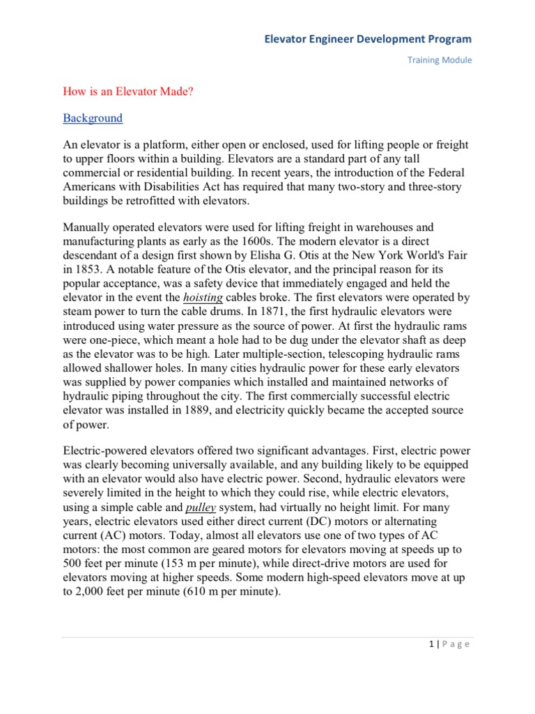 How is an Elevator Made? Background An elevator is a platform, either open or enclosed, used for lifting people or freight to upper floors within a building. Elevators are a standard part of any tall commercial or residential building. In recent years, the introduction of the Federal Americans with Disabilities Act has required that many two-story and three-story buildings be retrofitted with elevators. Manually operated elevators were used for lifting freight in warehouses and manufacturing plants as early as the 1600s. The modern elevator is a direct descendant of a design first shown by Elisha G. Otis at the New York World's Fair in 1853. A notable feature of the Otis elevator, and the principal reason for its popular acceptance, was a safety device that immediately engaged and held the elevator in the event the hoisting cables broke. The first elevators were operated by steam power to turn the cable drums. In 1871, the first hydraulic elevators were introduced using water pressure as the source of power. At first the hydraulic rams were one-piece, which meant a hole had to be dug under the elevator shaft as deep as the elevator was to be high. Later multiple-section, telescoping hydraulic rams allowed shallower holes. In many cities hydraulic power for these early elevators was supplied by power companies which installed and maintained networks of hydraulic piping throughout the city. The first commercially successful electric elevator was installed in 1889, and electricity quickly became the accepted source of power. Electric-powered elevators offered two significant advantages. First, electric power was clearly becoming universally available, and any building likely to be equipped with an elevator would also have electric power. Second, hydraulic elevators were severely limited in the height to which they could rise, while electric elevators, using a simple cable and pulley system, had virtually no height limit. For many years, electric elevators used either direct current (DC) motors or alternating current (AC) motors. Today, almost all elevators use one of two types of AC motors: the most common are geared motors for elevators moving at speeds up to 500 feet per minute (153 m per minute), while direct-drive motors are used for elevators moving at higher speeds. Some modern high-speed elevators move at up to 2,000 feet per minute (610 m per minute).