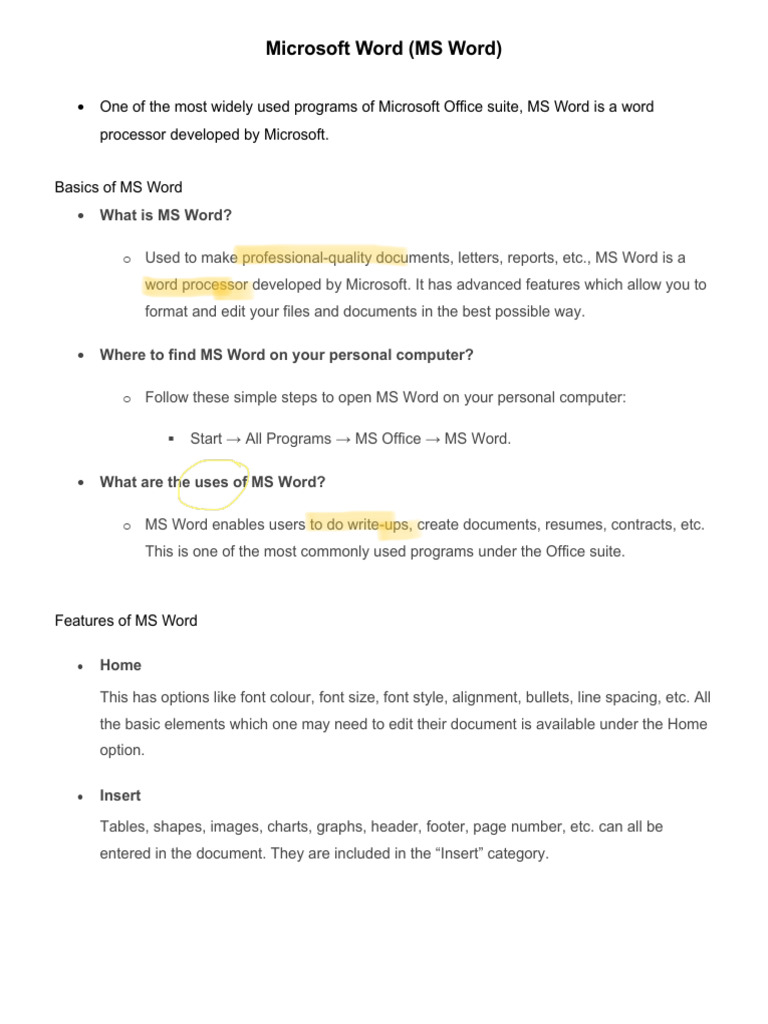 o MS Word enables users to do write-ups, create documents, resumes, contracts, etc.