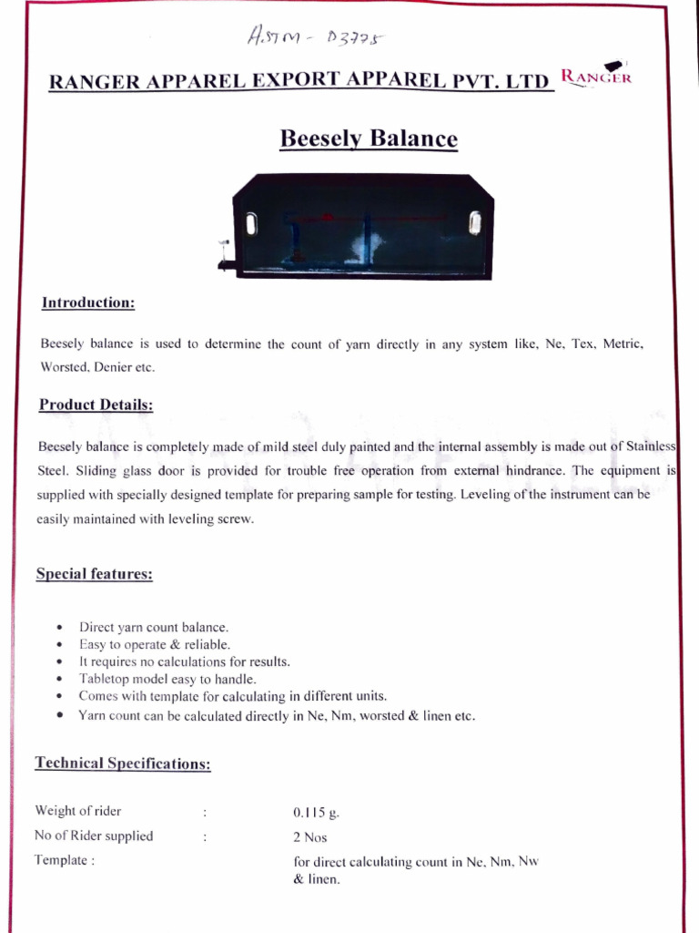 Beesely balance is used to determine the count of yarn directly in any system like, Ne, Tex, Metric,