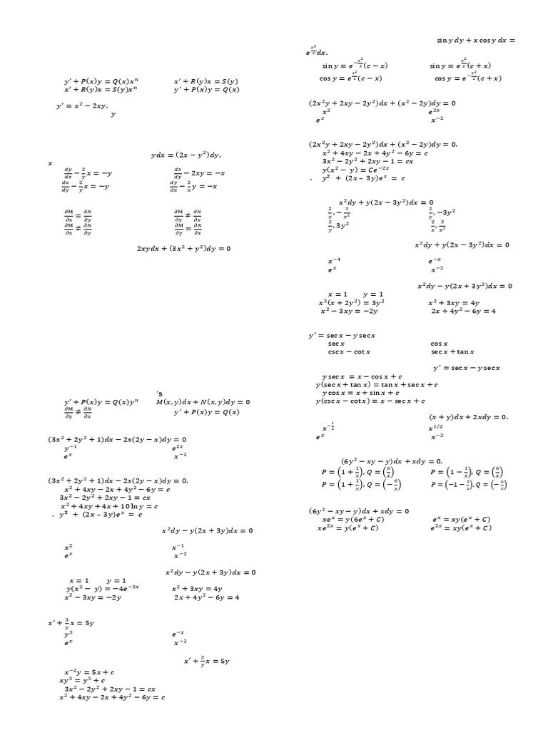 a. 𝑦 ′ + 𝑃(𝑥)𝑦 = 𝑄(𝑥)𝑦 𝑛 c.𝑀(𝑥, 𝑦)𝑑𝑥 + 𝑁(𝑥, 𝑦)𝑑𝑦 = 0 d. 𝑦(csc 𝑥 − cot 𝑥) = 𝑥 − sec 𝑥 + 𝑐