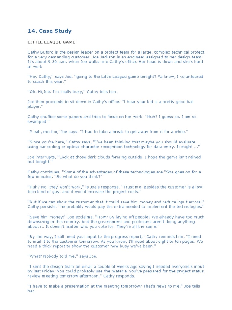 LITTLE LEAQUE GAME Cathy Buford is the design leader on a project team for a large, complex technical project for a very demanding customer. Joe Jackson is an engineer assigned to her design team. It's about 9:30 a.m. when Joe walks into Cathy's office. Her head is down and she's hard at work. ''Hey Cathy,'' says Joe, ''going to the Little League game tonight? Ya know, I volunteered to coach this year.'' ''Oh. Hi,Joe. I'm really busy,'' Cathy tells him. Joe then proceeds to sit down in Cathy's office. ''I hear your kid is a pretty good ball player.'' Cathy shuffies some papers and tries to focus on her work. ''Huh? I guess so. I am so swamped.'' ''Y eah, me too,''Joe says. ''I had to take a break to get away from it for a while.'' ''Since you're here,'' Cathy says, ''I've been thinking that maybe you should evaluate using bar coding or optical character recognition technology for data entry. It might ...'' Joe interrupts, ''Look at those dark clouds forming outside. I hope the game isn't rained out tonight.'' Cathy continues, ''Some of the advantages of these technologies are ''She goes on for a few minutes. ''So what do you think?'' ''Huh? No, they won't work,'' is Joe's response. ''Trust me. Besides the customer is a lowtech kind of guy, and it would increase the project costs.'' ''But if we can show the customer that it could save him money and reduce input errors,'' Cathy persists, ''he probably would pay the extra needed to implement the technologies.'' ''Save him money!'' Joe exclaims. ''How? By laying off people? We already have too much downsizing in this country. And the government and politicians aren't doing anything about it. It doesn't matter who you vote for. They're all the same.'' ''By the way, I still need your input to the progress report,'' Cathy reminds him. ''I need to mail it to the customer tomorrow. As you know, I'll need about eight to ten pages. We need a thick report to show the customer how busy we've been.'' ''What? Nobody told me,'' says Joe. ''I sent the design team an email a couple of weeks ago saying I needed everyone's input by last Friday. You could probably use the material you've prepared for the project status review meeting tomorrow afternoon,'' Cathy responds. ''I have to make a presentation at the meeting tomorrow? That's news to me,'' Joe tells her.