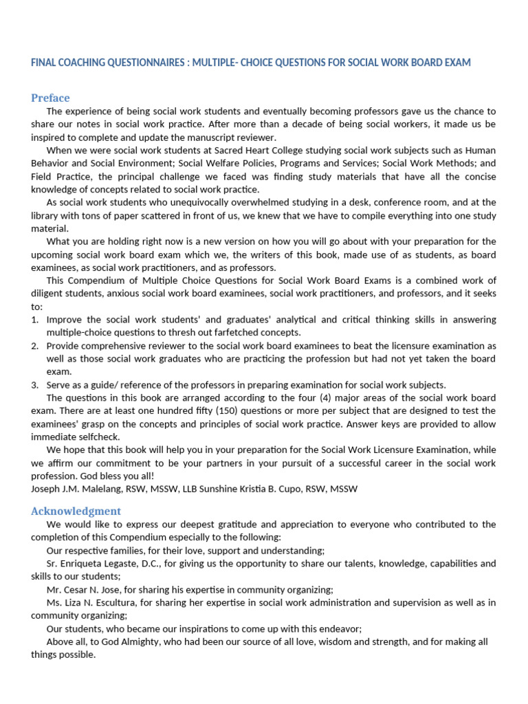 This compendium of multiple-choice questions will assist you in your preparation for the Social Work