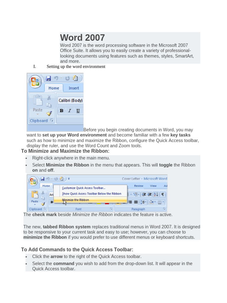 such as how to minimize and maximize the Ribbon, configure the Quick Access toolbar,