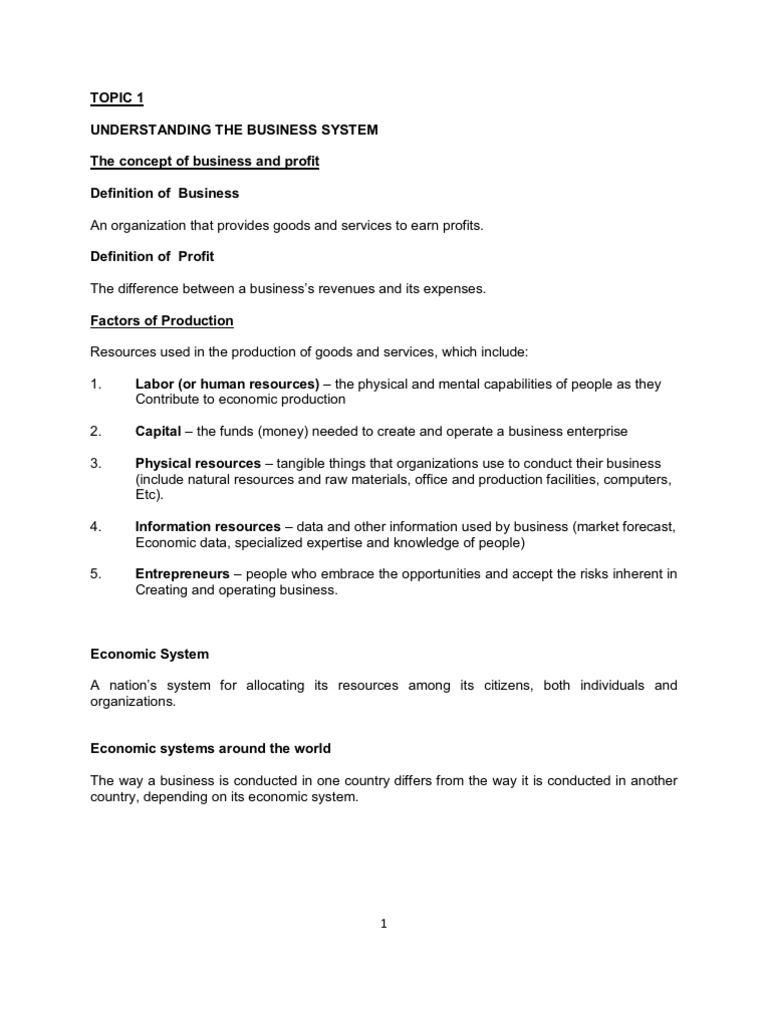 goods and services to earn profits. Definition of Profit The difference between a businesss revenues and its expenses. Factors of Production Resources used in the production of goods and services, which include: 1. 2. 3. Labor (or human resources) the physical and mental capabilities of people as they Contribute to economic production Capital the funds (money) needed to create and operate a business enterprise Physical resources tangible things that organizations use to conduct their business (include natural resources and raw materials, office and production facilities, computers, Etc). Information resources data and other information used by business (market forecast, Economic data, specialized expertise and knowledge of people) Entrepreneurs people who embrace the opportunities and accept the risks inherent in Creating and operating business.