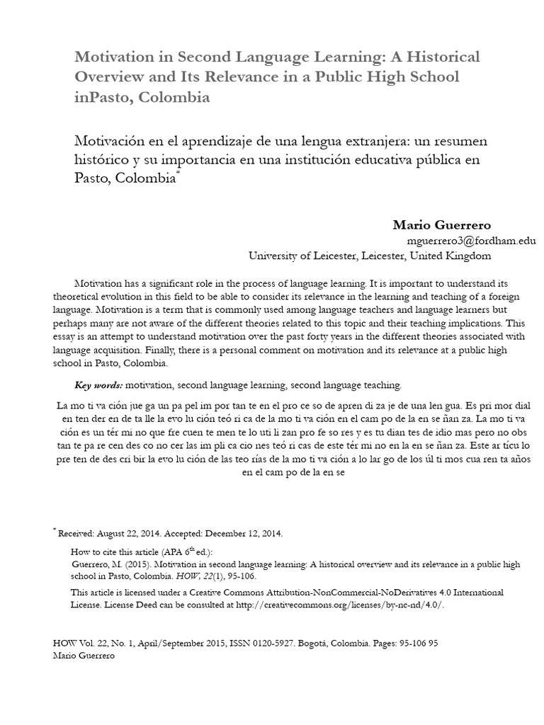 Guerrero, M. (2015). Motivation in second language learning: A historical overview and its relevance in a public high