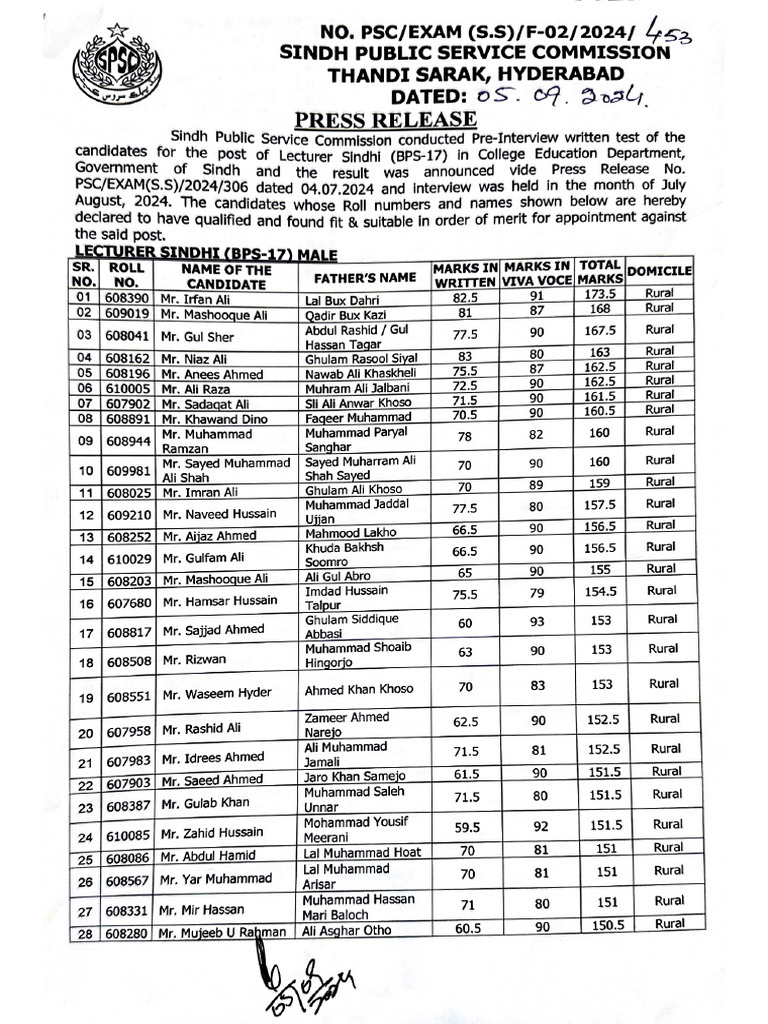 01 | 608390 | Mr. Trfan Ali Lal Bux Dahri 82.5 1 173.5 | Rural