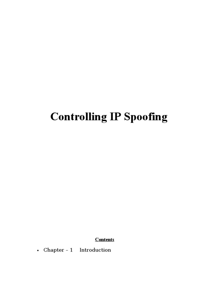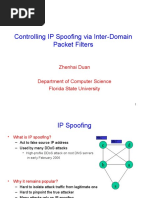 A key feature of our scheme is that it does not require global routing information. IDPFs are constructed from the information implicit in Border Gateway Protocol (BGP) route updates and are deployed in network border routers. We establish the conditions under which the IDPF framework correctly works in that it does not discard packets with valid source addresses. Based on extensive simulation studies, we show that, even with partial employment on the Internet, IDPFs can proactively limit the spoofing capability of attackers. 1.2 ). Project Description: Packets sent using the IP protocol include the IP address of the sending host. The recipient directs replies to the sender using this source address. However, the correctness of this address is not verified by the protocol. The IP protocol specifies no method for validating the authenticity of the packets source. This implies that an attacker can forge the source address to be any desired. This is almost exclusively done for malicious or at least inappropriate purposes. Given that attackers can exploit this weakness for many attacks, it would be beneficial to know if network traffic has spoofed source addresses. This is a well-known problem and has been well described In all but a few rare cases, sending spoofed packets is done for illegitimate purposes Sending IP packets with forged source addresses is known as packet spoofing and is used by attackers for several purposes. These include obscuring the true source of the attack, implicating another site as the attack origin, pretending to be a trusted host, hijacking or intercepting network traffic, or causing replies to target another system. Because none of these are desirable, it is useful to determine if a packet has a spoofed source address. In cases where an ongoing attack is occurring it