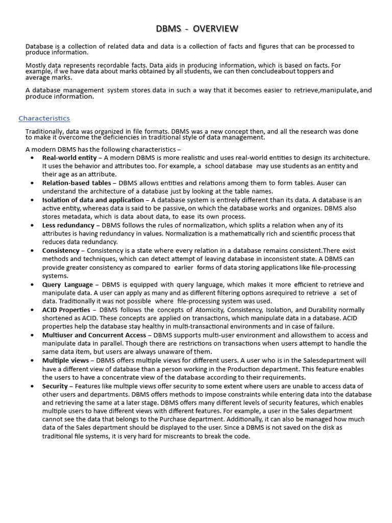 • ACID Properties − DBMS follows the concepts of Atomicity, Consistency, Isolation, and Durability normally